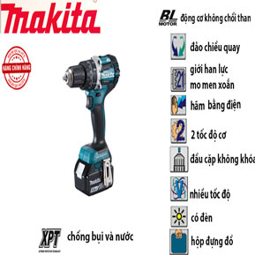 Máy khoan vặn vít dùng pin DHP484 makita chính hãng Hải Phòng. Máy khoan thép 13mm, khoan trên gỗ 38mm, khoan trên tường 13mm. Công nghệ không chổi than, công nghệ chống bụi và nước cho tuổi thọ máy bền lâu. Thay mũi dễ dàng với khóa không đầu kẹp. Giới hạn lục moomen và phanh hãm bằng điện an toàn cho người dùng